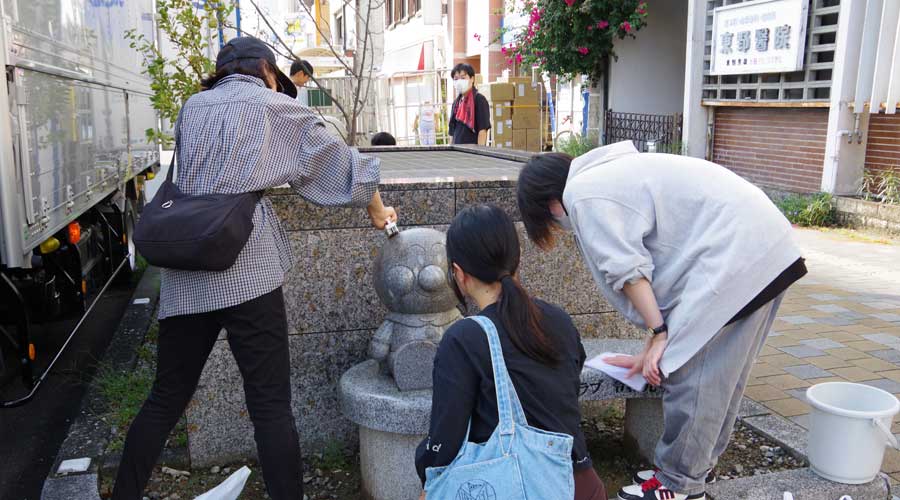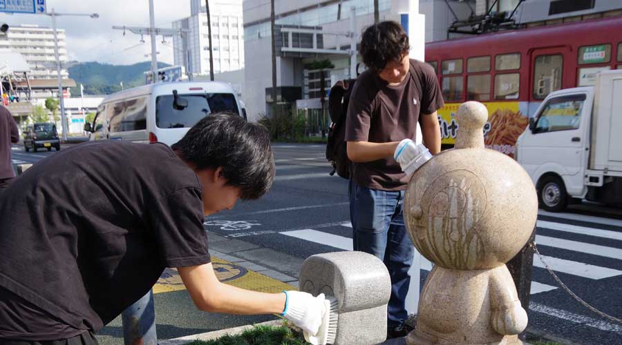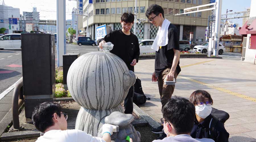 当日は、高知駅前から中央公園周辺のアンパンマン像を中心に清掃を実施。学生たちは用意されたブラシや雑巾、水を手に、像のすみずみまで丁寧に磨き上げました。2年生以上の学生にとっては毎年恒例の行事。手慣れた動きで、短時間でピカピカに。初めて参加する1年生たちも、先輩の姿を見ながら一生懸命に取り組み、協力し合って作業を進めました。