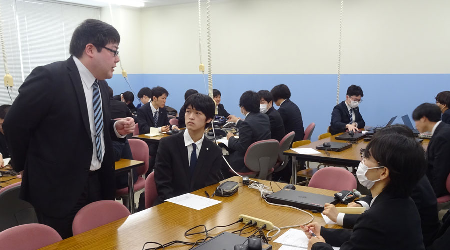 後半の30分間は、学生を6グループに分けた少人数制の座談会形式で行われました。講師が各テーブルを回ることで緊張が緩和され、全員が質問を投げかける活発な時間となりました。