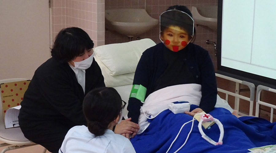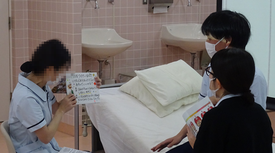 例えば「3歳の白血病の子どもに、感染症予防の方法や重要性をどう伝えるか」というテーマ。患者役・家族役・看護師役を担当し、手づくりの教材や物品を使いながらロールプレイングに挑戦しました。