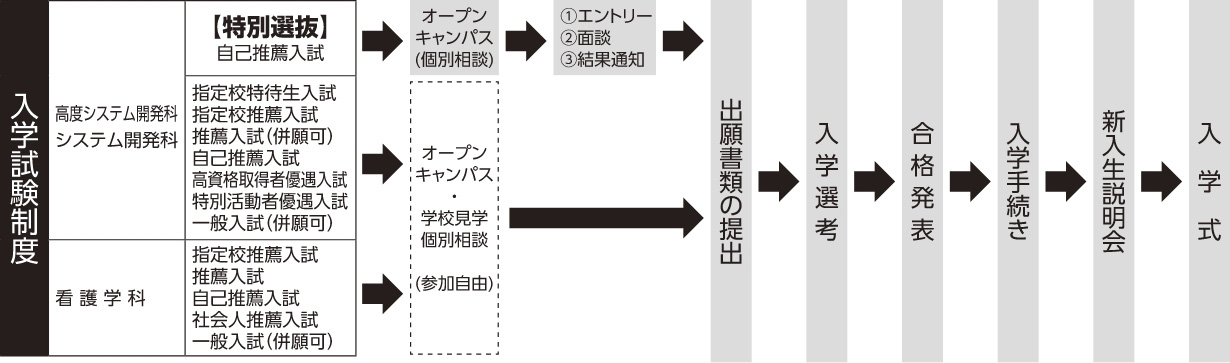 本校の他に大学や短大・公務員・就職などと併願する者に対し、併願先の合否結果が出るまで、本校の入学権利を確保することができる制度です。(5. 出願から入学式までの流れを参照ください)
